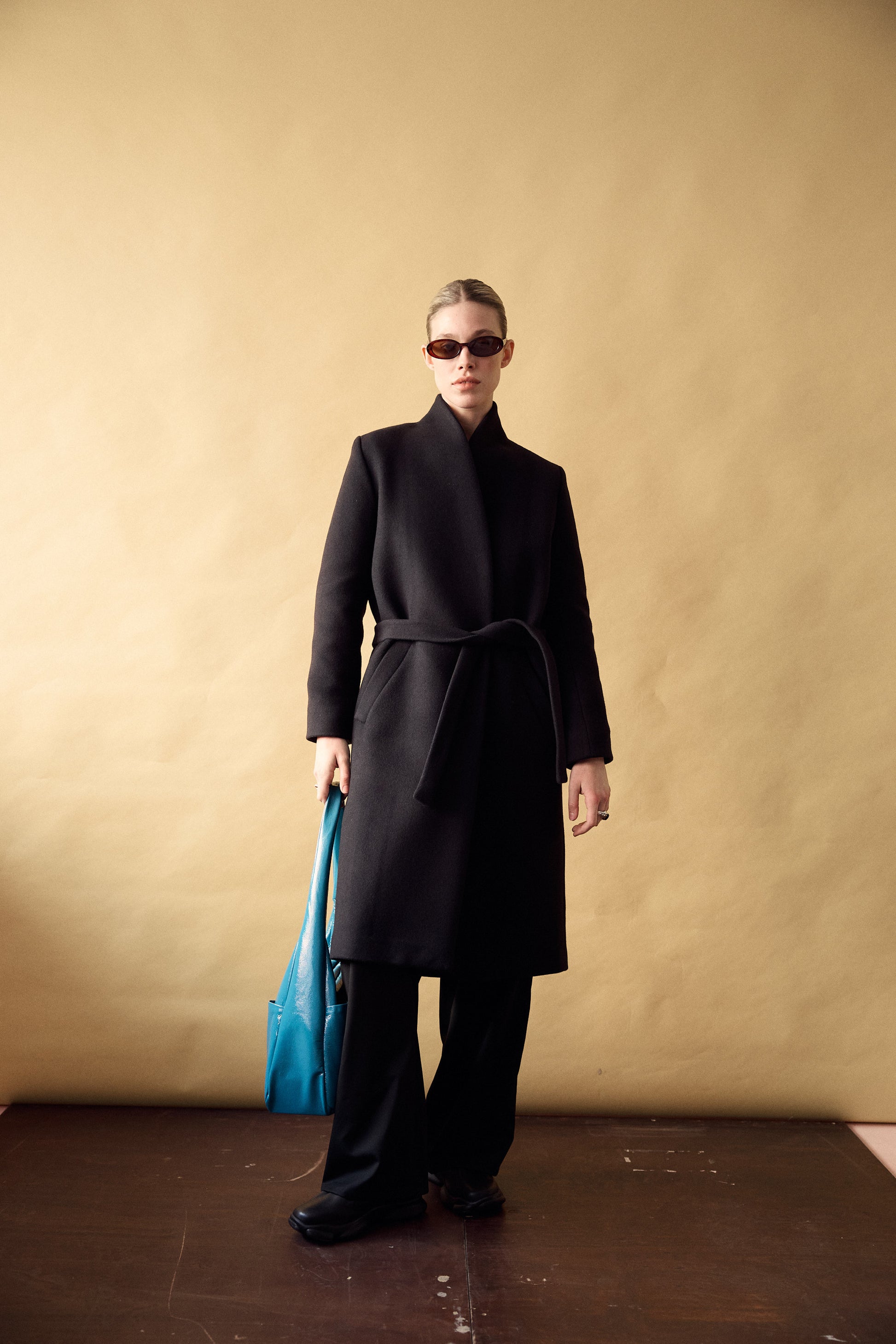 Kollektion Herbst / Winter 2025 - Tasche Boly: Eine schwarze, innen gefütterte Umhängetasche mit einem langen Schulterriemen, Reißverschluss sowie je zwei kleinen Außentaschen.
